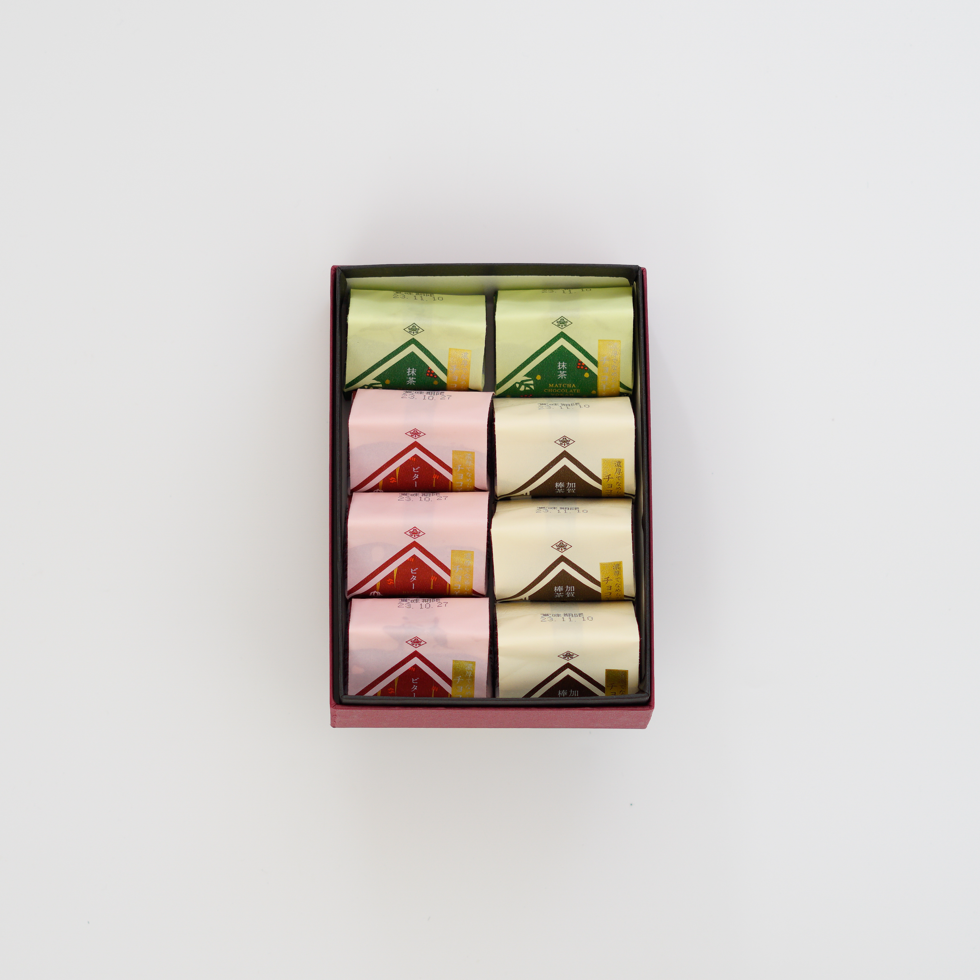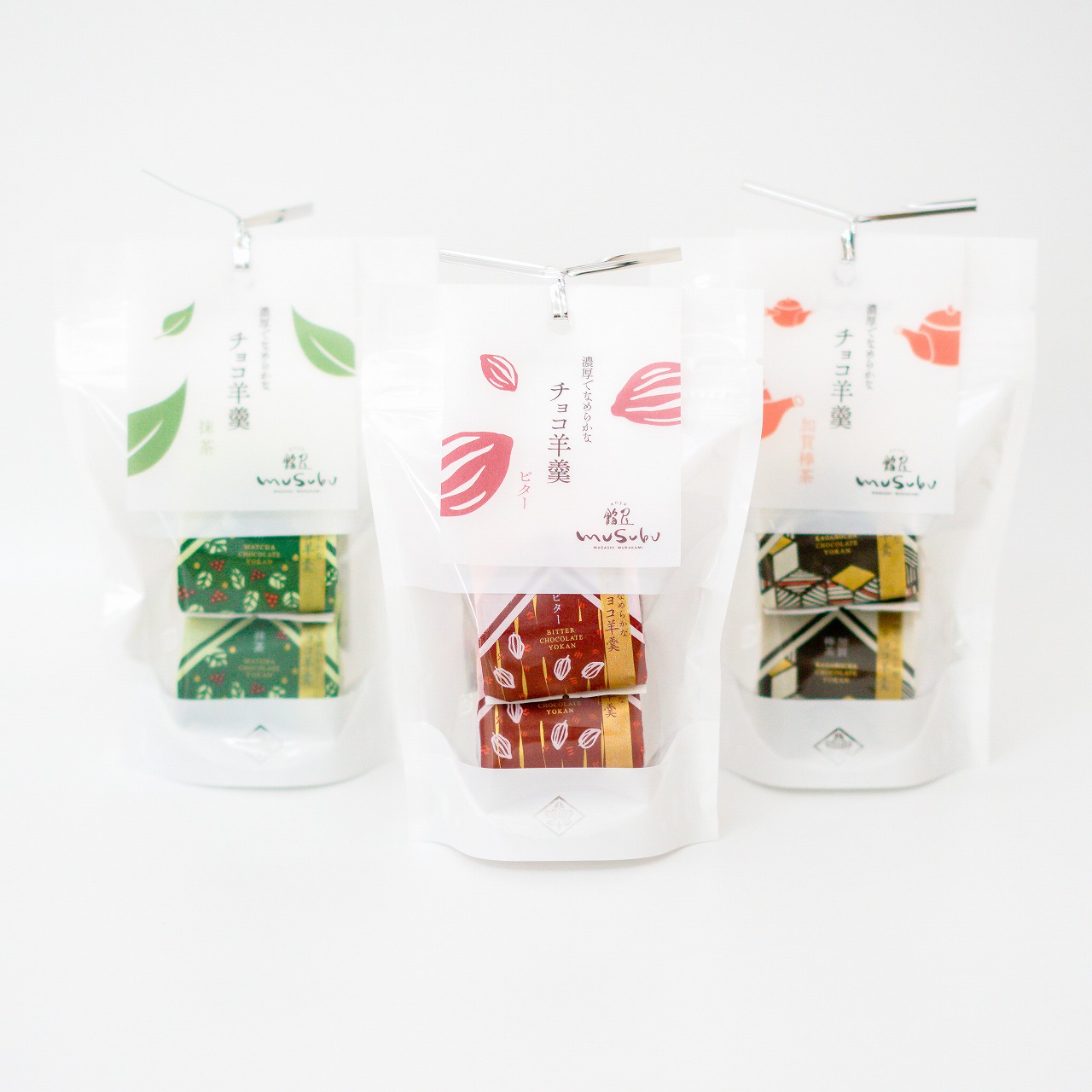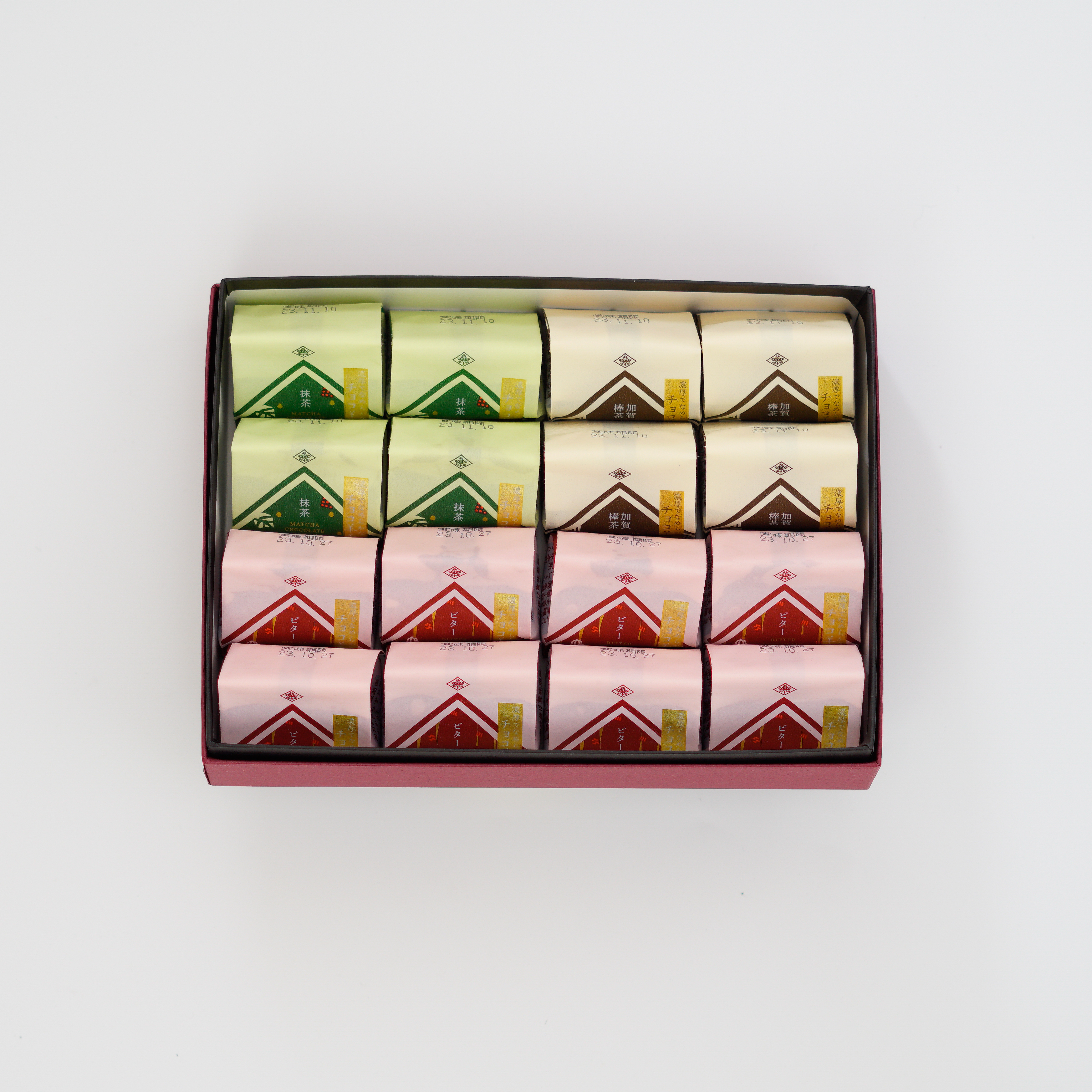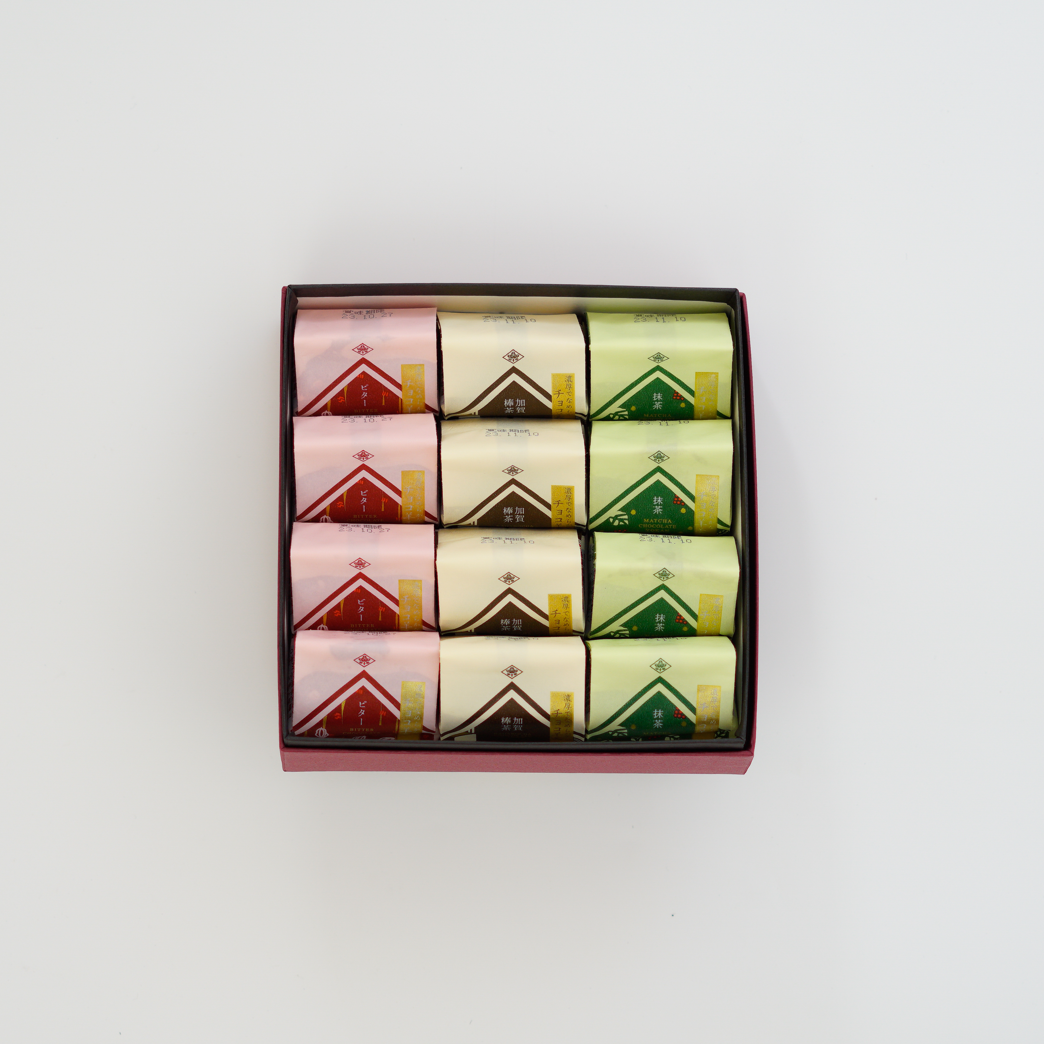 ビターチョコ、抹茶、加賀棒茶の3つの風味で、日本茶にもコーヒーにもピッタリです。