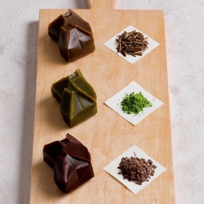 ビターチョコ、抹茶、加賀棒茶の3つの風味で、日本茶にもコーヒーにもピッタリです。